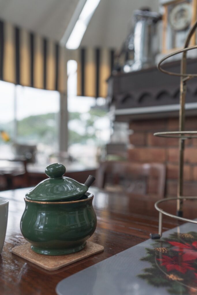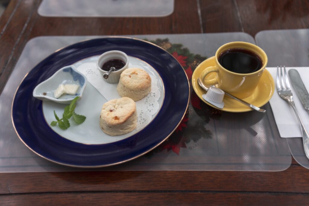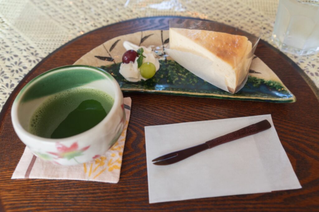 素敵なお盆に乗ったお抹茶とチーズケーキが