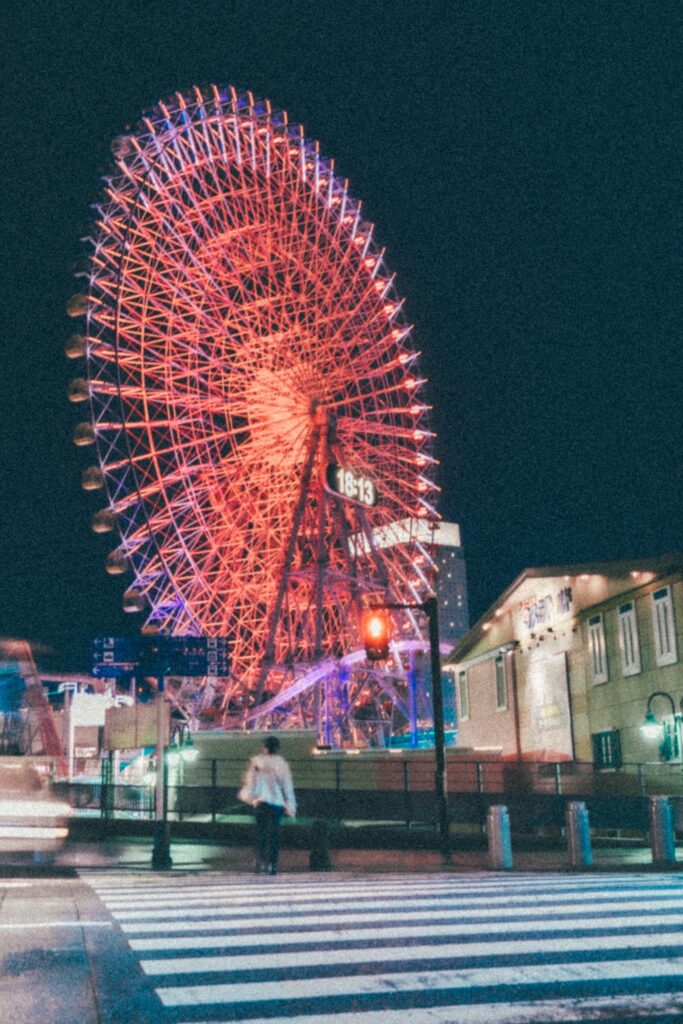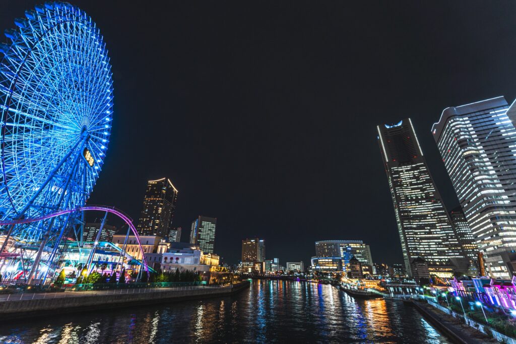 ちょうど日が暮れたよこはまコスモワールド付近で